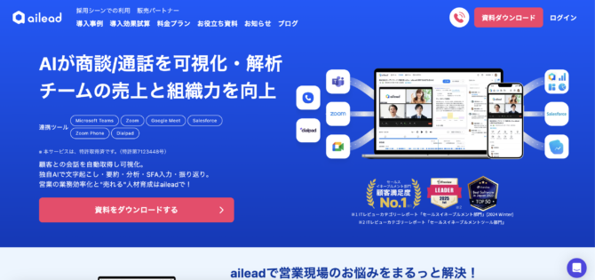 AIが通話品質をスコアリングし、改善が必要なポイントを具体的に提示します。同社のインサイドセールス代行サービスで培ったノウハウが反映されており、実践的な改善提案が強みです。