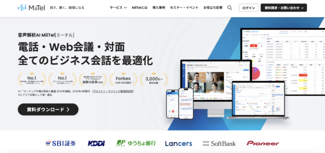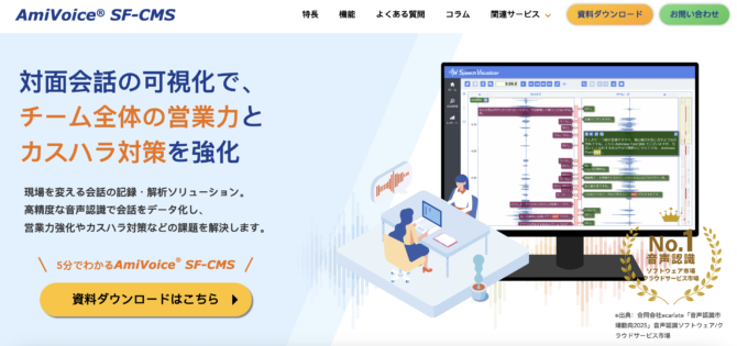 商談や会議の音声を高精度でテキスト化し、感情分析やキーワード抽出を行います。オンプレミスとクラウドの両方の環境を選択可能で、セキュリティ要件が厳しい企業にも適しています。コールセンター向けの導入実績が豊富です。