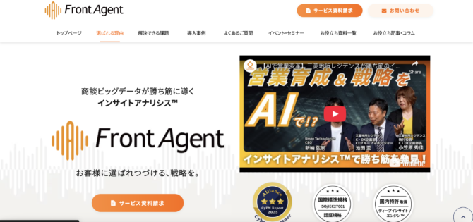 Front Agentは、umbrElla株式会社が提供するAI商談分析・セールスイネーブルメントツールです。商談の録画・文字起こしに加え、AIが商談内容を自動で分類・タグ付けする機能を持ちます。