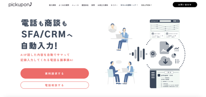 pickuponは、pickupon株式会社が提供するAI搭載クラウド型CTIサービスです。電話の発着信をクラウド上で管理し、通話内容を自動で録音・文字起こしします。
