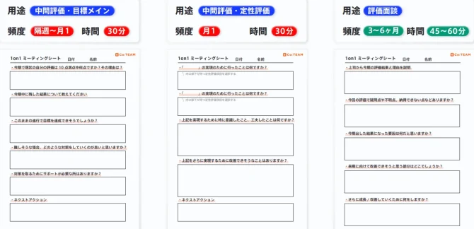 実際に弊社の1on1ツール「Co:TEAM(コチーム)」を導入した事例では、準備時間が半減し、話す内容は3倍に増えました。1on1ツールは準備の手間を減らすだけでなく、ミーティングの効率化にもつながります。
