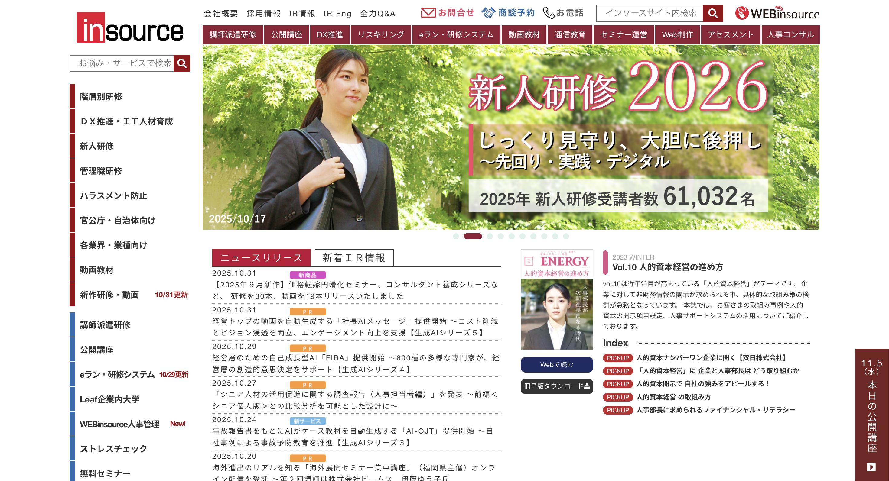 公開講座・講師派遣・オンライン研修やeラーニング、アセスメント、研修管理SaaS(Leaf)まで、研修関連サービスをワンストップで提供しています。階層別・テーマ別の豊富なプログラムに加え、課題に応じたカスタム設計や受講管理のデジタル運用にも対応しています。