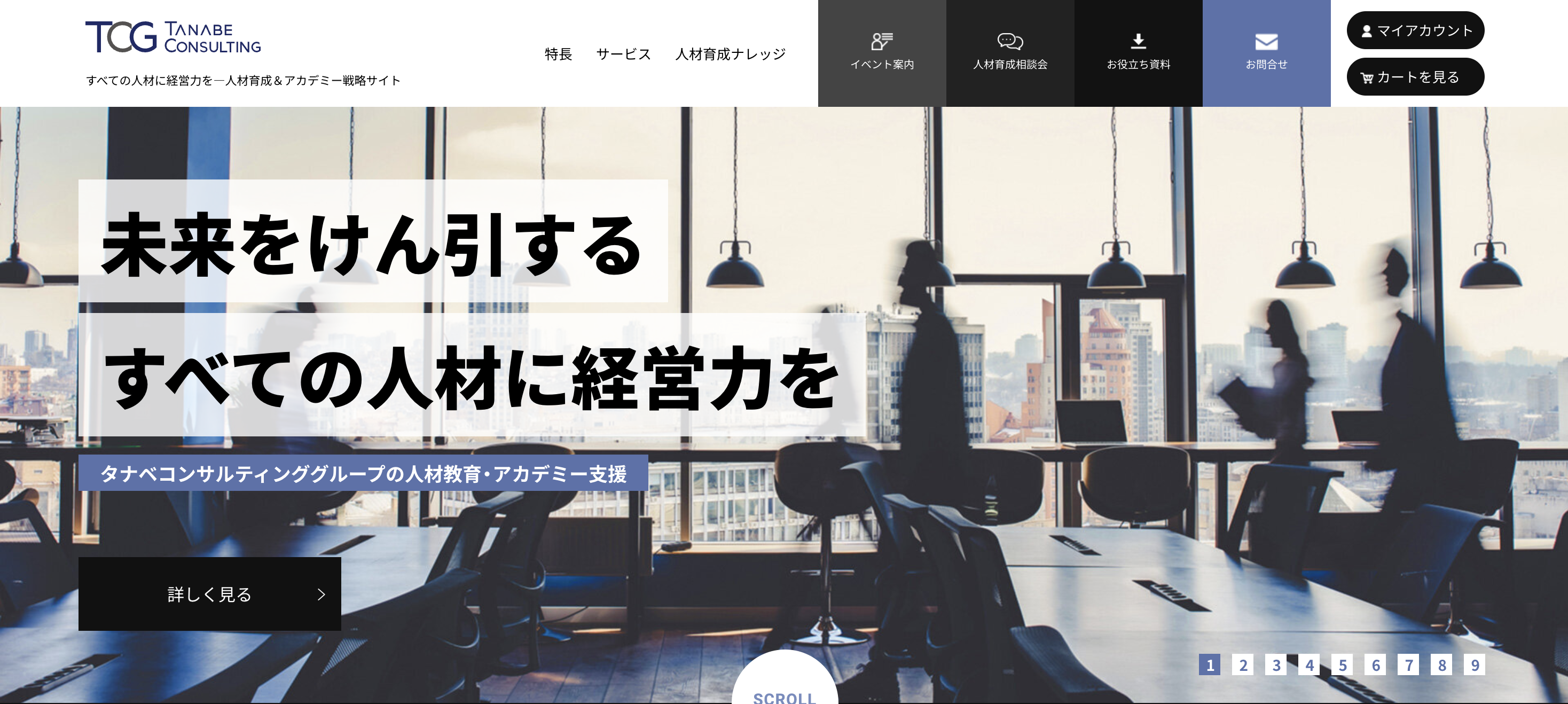 経営コンサルティングと人材開発を一体で支援し、階層別・テーマ別の研修や次世代経営者育成、人的資本経営支援などを提供しています。公開型のタナベ経営スクール等も展開し、オンライン/集合型の両方に対応しています。
