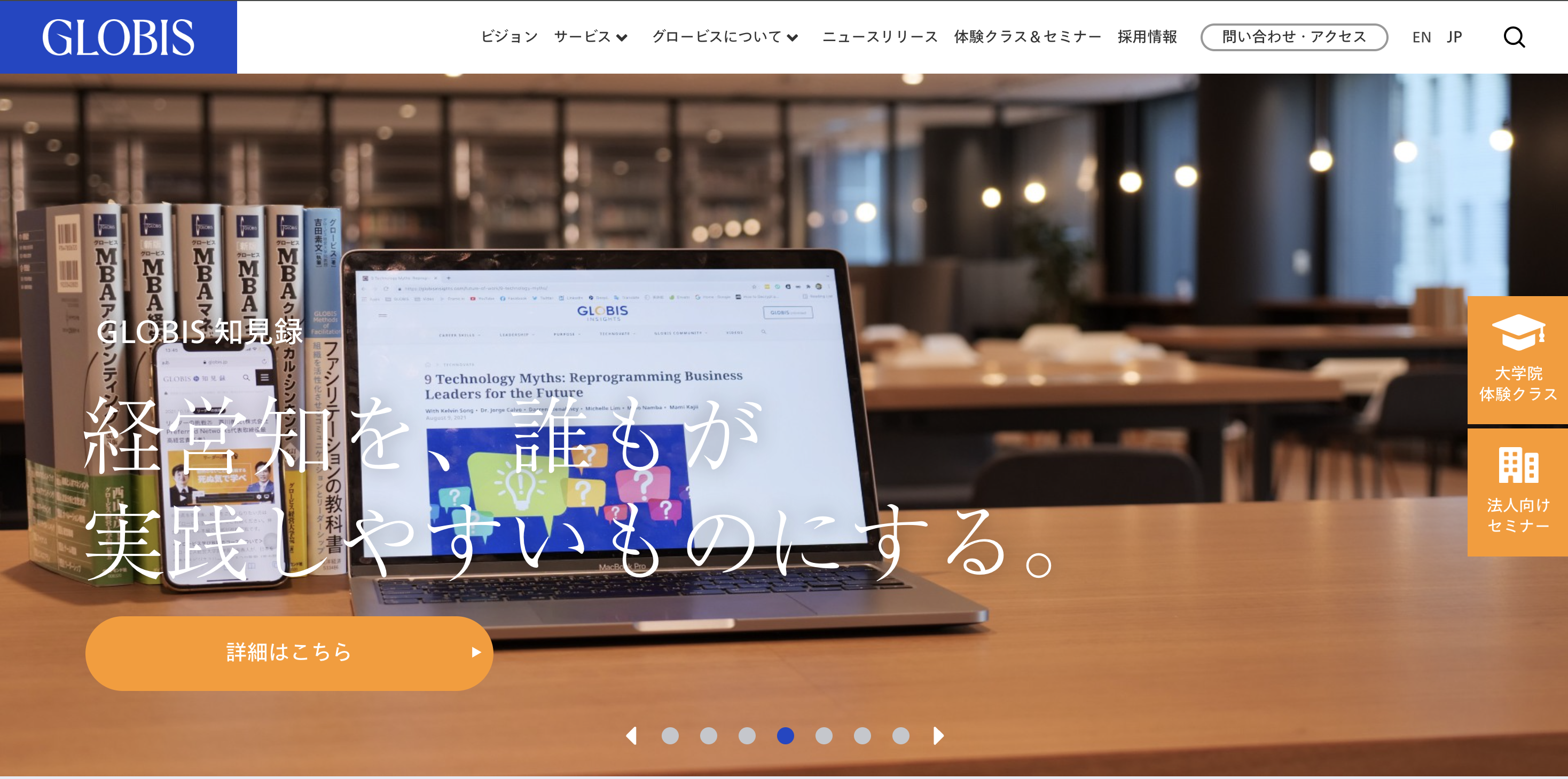 主に法人向け企業内研修(リーダーシップ・マネジメント・戦略・財務・思考系など)やアセスメントなど、研修関連サービスを提供しています。GLOBIS 学び放題(eラーニング)や公開講座/オンライン/英語プログラムなど、講座コンテンツも充実しています。