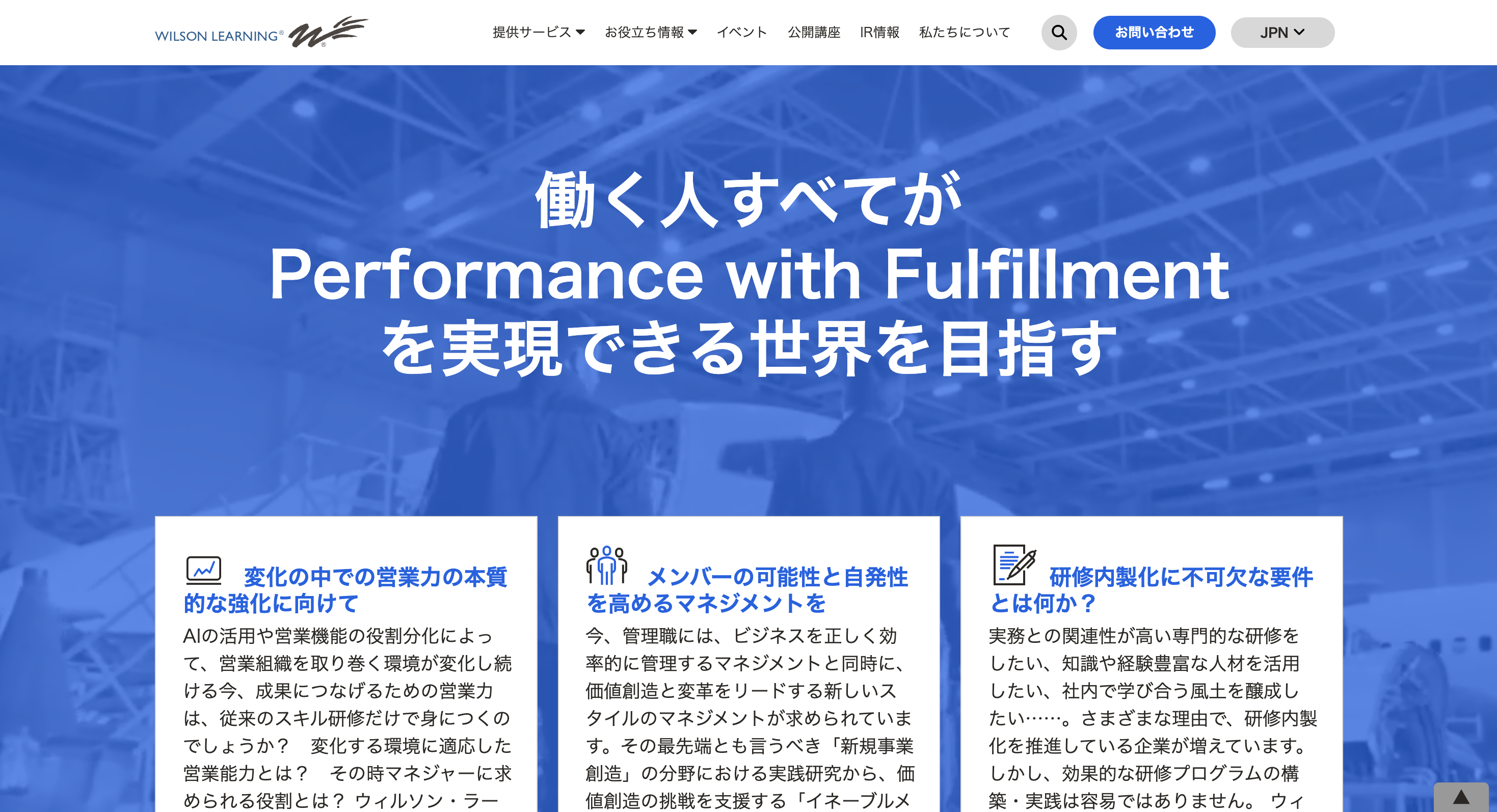 営業力・サービス力強化、リーダーシップ/マネジメント領域の研修をグローバルに提供しています。代表的なプログラムにCSP(The Counselor Salesperson)やLFP(Leading for Performance)などがあり、日本法人による日本語での導入支援/カスタマイズに対応しています。