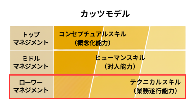 | テクニカルスキル | 作業指導や新人トレーニングを担当することが多い。実務経験や技術、専門知識が不可欠で、ロワーマネジメントで最も重視されるスキル。 |