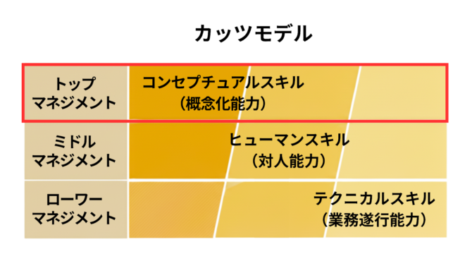 | コンセプチュアルスキル | 組織のビジョンを定義して具体的な戦略に落とし込んだり、市場環境を読み取り方向性を決めたりするうえで求められる。最も重視されるスキル。 |