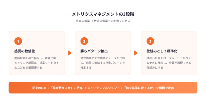 つまり、メトリクスマネジメントの価値は何をどの数値までできればよいかを明確にする点にあります。感覚の営業から数値の営業への転換が、育成の属人化を解消する起点です。
