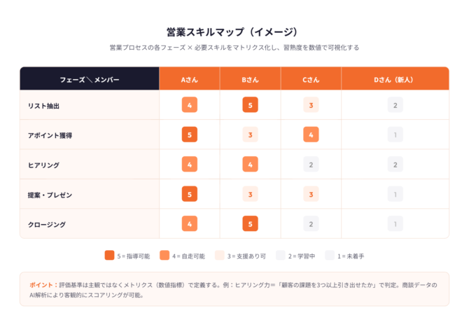 スキルマップは、営業プロセスの各フェーズと必要スキルをマトリクス化し、個人ごとの習熟度を3〜5段階で評価する形式が実用的です。重要なのは評価基準を主観ではなくメトリクス(数値指標)で定義することにほかなりません。たとえばヒアリング力であれば、顧客の課題を3つ以上引き出せたかのように定量化します。