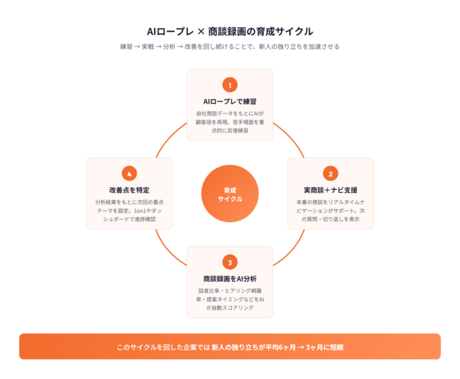 一般的に新人営業の独り立ちには6ヶ月程度かかりますが、商談データの分析とAIロープレを組み合わせた仕組みを導入した企業では3ヶ月に短縮された事例があります。仕組みの有無で期間は大きく変わります。