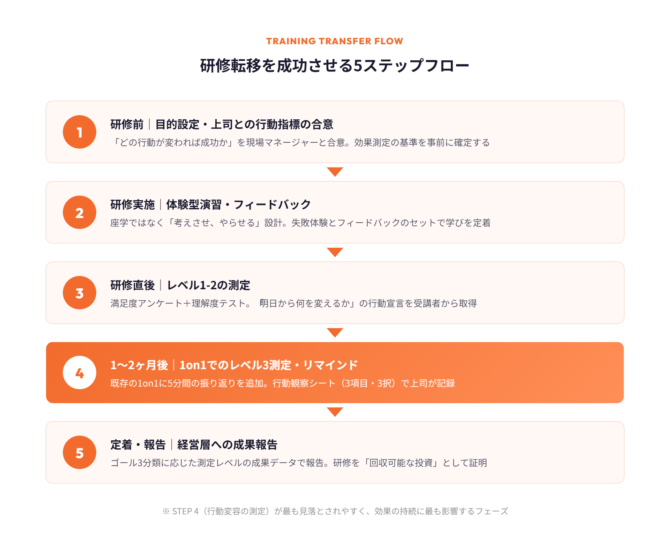 研修転移を成功させるには、研修前(目的設定・上司との行動指標の合意)→ 研修実施(体験型演習・フィードバック)→ 研修直後(レベル1-2の測定)→ 1〜2ヶ月後(1on1でのレベル3測定・リマインド)→ 定着・報告(経営層への成果報告)の一連のフローを事前に設計しておくことが効果を左右します。