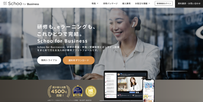 法人向けサービス「Schoo for Business」では、場所や時間にとらわれず受講できるオンライン研修を通じて、社員の自律学習やリスキリング、階層別研修、管理職研修などを支援できる点が強みです。
