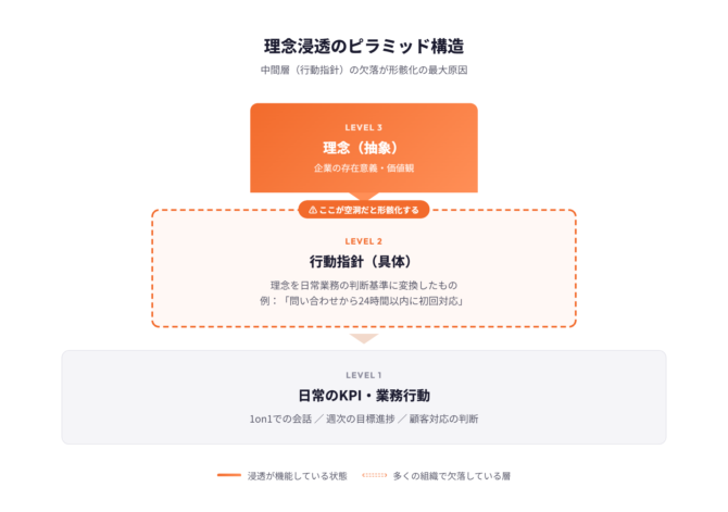 理念浸透の構造はピラミッド型で整理できます。頂点に理念、中間に行動指針、底辺に日常のKPIや具体的行動が並びます。形骸化が起きている組織では、このピラミッドの中間層が空洞になっています。