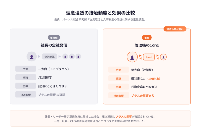 従来は年に数回の経営方針発表会で浸透を図る手法が主流でした。しかし現在は、管理職が週次の1on1で理念と業務を接続する対話型の設計が求められています。接触回数の差が浸透の質を左右するためです。