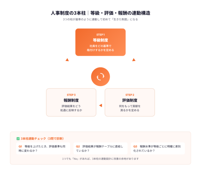 3つの柱は独立した別制度ではなく、歯車のように噛み合って回る一体構造です。等級が上がれば求められる行動水準も上がり、評価基準が変わる。評価結果は報酬に直結し、報酬が等級にふさわしい水準に設定されている。連動が途切れた瞬間、社員は「何を頑張れば報われるのか」を見失います。