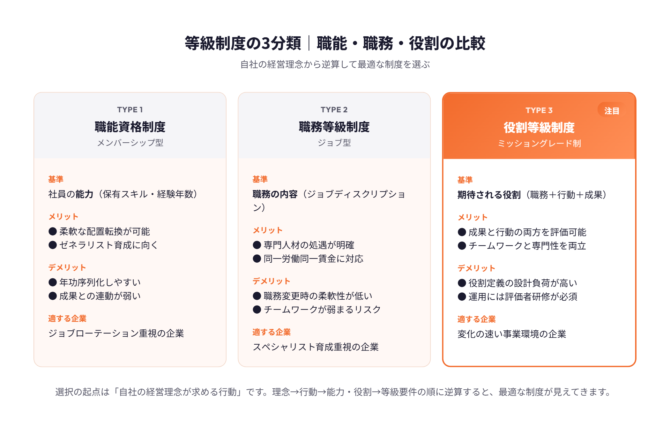 等級制度は「何を基準に社員を格付けするか」によって、職能資格制度(メンバーシップ型)・職務等級制度(ジョブ型)・役割等級制度(ミッショングレード制)の3つに大別されます。職能資格制度は社員の能力を基準とし、職務等級制度はジョブディスクリプション(職務記述書)に基づく職務内容を基準とし、役割等級制度は期待される役割を基準とします。