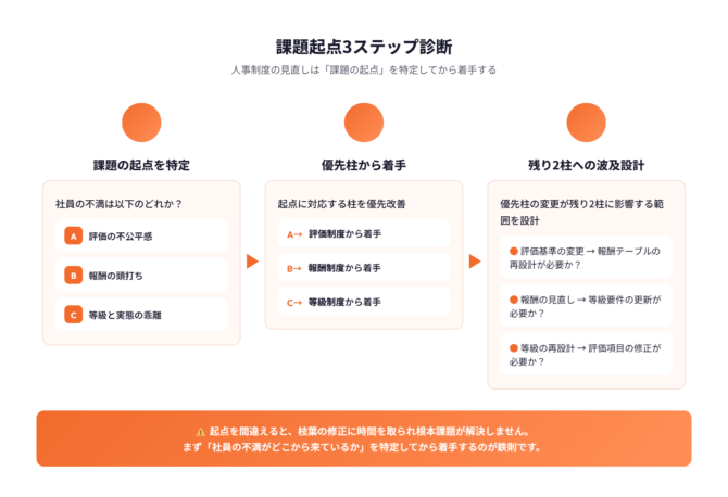 自社の最大課題がどこにあるかを特定することが、評価制度設計の第一歩です。200社超の支援で繰り返し有効だった手順を体系化すると、「課題起点3ステップ診断」として整理できます。ステップ1: 課題の起点は「評価の不公平感」か「報酬の頭打ち」か「等級と実態の乖離」かを特定する。ステップ2: 課題の起点に対応する柱から優先的に着手する。ステップ3: 残り2つの柱への波及を設計する。起点を間違えると、枝葉の修正に時間を取られ、根本課題が解決しないまま時間だけが過ぎていきます。[※AI生成・要レビュー:自社データで差替え推奨]