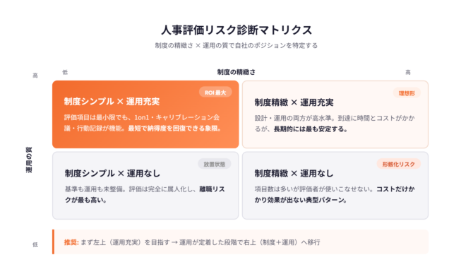 「制度を変えなければ根本解決にならないのでは」と考える人事担当者は少なくありません。期末面談のたびに社員から「基準がわかりにくい」と指摘され、経営層からも「制度を刷新しろ」と迫られる場面は珍しくないでしょう。しかし、制度改定には半年以上の設計期間と全社説明のコストがかかり、その間も評価エラーは放置され続けます。