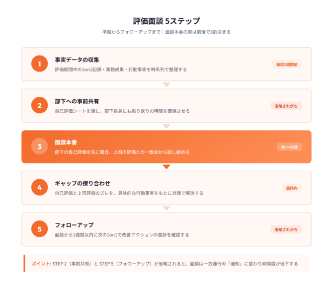 5ステップは次のとおりです。第1段階は事実データの収集で、評価期間中の1on1記録・業務成果・行動事実を時系列で整理します。第2段階は部下への事前共有で、面談の2〜3日前に自己評価シートを渡し、部下自身にも振り返りの時間を確保させます。