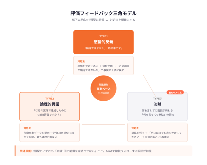 部下が評価に納得しない反応は、大きく3つの類型に分かれます。この3類型を「評価フィードバック三角モデル」として整理すると、反応の種類に応じた対処法が明確になります。