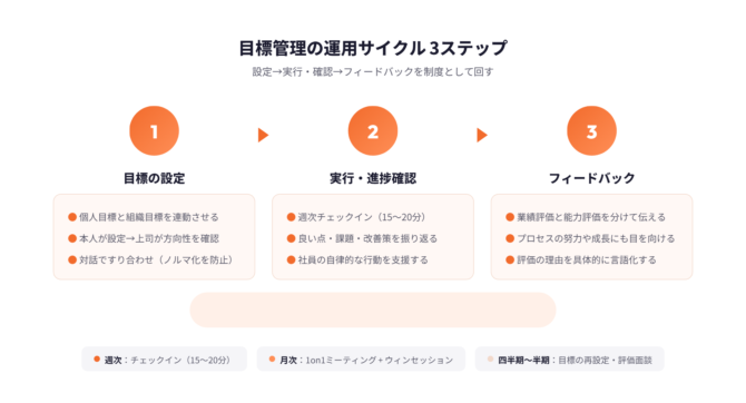 目標管理の運用は、①目標の設定、②業務の実行・進捗確認、③上司からのフィードバックの3ステップで構成されます。3つがサイクルとして回ることで、目標管理は「期末イベント」ではなく「日常の仕組み」になります。