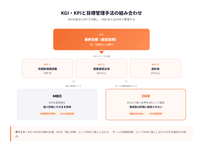 たとえば、全社のKGIが「年間売上10億円」であれば、KPIツリー(ロジックツリー)でKGIを分解し、「月間新規商談数」「提案書提出率」「成約率」といった中間指標を設定します。KPIを個人の目標としてMBOに落とし込むか、チームの挑戦目標としてOKRに落とし込むかが、手法選定の分岐点です。