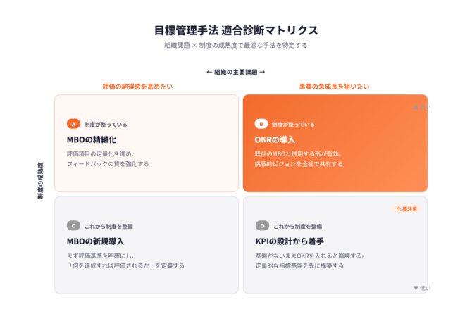 | これから制度を整備する組織 | MBOの新規導入(まず評価基準を明確にする) | KPIの設計から着手(基盤がないままOKRを入れると崩壊する) |