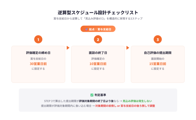 ステップ1: 賞与支給日を起点に、評価確定の締め日を「支給日の30営業日前」に設定します。ステップ2: 評価確定の締め日から逆算して、フィードバック面談の終了日を「締め日の10営業日前」に置きます。ステップ3: 面談終了日から逆算し、自己評価の提出期限を「面談開始の15営業日前」に設定します。