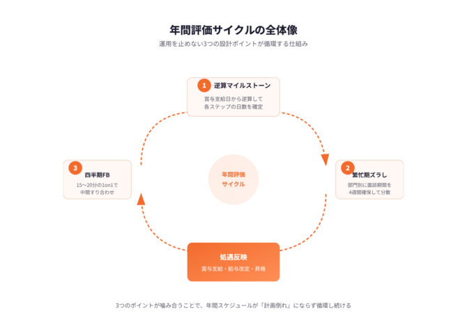 読了後には、自社の決算期に合った評価スケジュールの全体像が把握でき、繁忙期や見込み評価の問題を回避するための設計方針が固まっているはずです。
