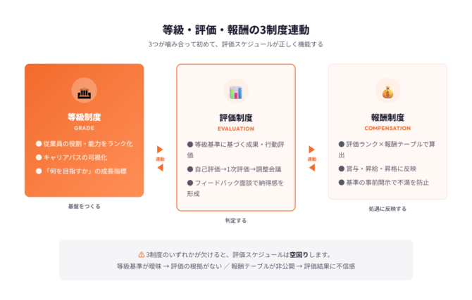 評価スケジュールの設計が完璧でも、等級・評価・報酬の3制度が連動していなければ、処遇反映のタイミングが噛み合わず、スケジュールそのものが空回りします。評価の結果が処遇に正しく反映される設計が、スケジュール運用の前提条件です。