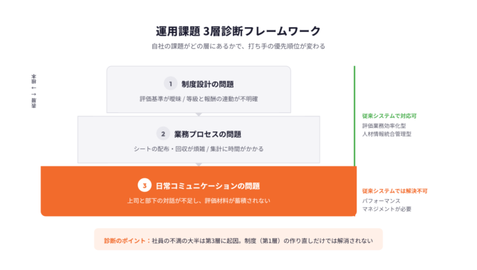 - 第3層: 日常コミュニケーションの問題 ── 上司と部下の対話が不足し、評価材料が蓄積されない。従来型のシステムでは解決できません
