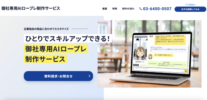 AIとの音声ロープレ、定量評価・フィードバック、法人向け管理者画面、受講状況・スコアの一括管理、個人無料利用 など。