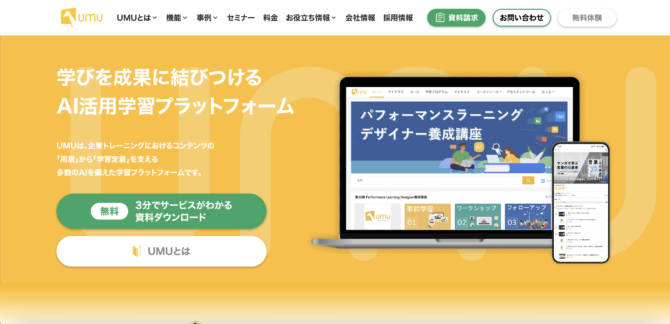 UMUは、学習プラットフォームとしての総合力が強みのAIロープレ対応ツールです。AIコーチング機能によるロープレに加え、マイクロラーニング・動画学習・テスト・アンケートなど多彩な学習機能を搭載しています。