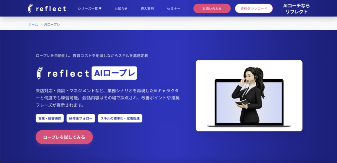 Reflect AIロープレは、無料アプリとして個人利用も可能なAIロープレツールです。スマートフォンアプリでAIとの音声ロープレを実施でき、法人向けには管理者画面で受講状況やスコアの一括管理が可能です。