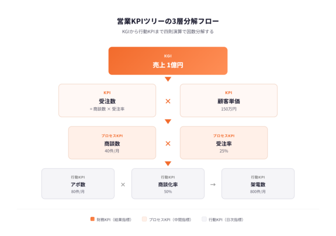 具体的に数字を入れると構造が見えてきます。仮にKGIが「月間売上1,000万円」で顧客単価100万円なら、必要な受注数は10件。受注率が25%なら商談数は40件、商談化率が50%ならアポ数80件、アポ率が10%なら架電数は800件です。