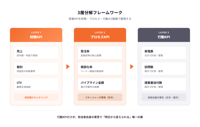 第3層の行動KPIは、架電数・訪問数・提案書送付数など、担当者が日々コントロールできる行動量の指標です。週次・日次で計測し、各営業担当者が責任を持ちます。行動KPIだけが、担当者自身の意思で「明日から変えられる」唯一の層です。