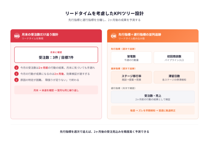 この時間軸のズレを解消するには、KPIを先行指標と遅行指標に分けてツリーに組み込む必要があります。先行指標は「今月の架電数・初回商談数」のように未来の成果を予測する指標、遅行指標は「今月の受注数・売上」のように過去の行動の結果を示す指標です。