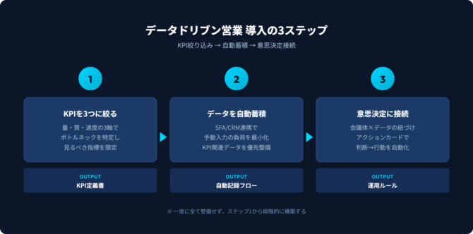 データドリブン営業の導入は、KPIの絞り込み・データの自動蓄積・意思決定への接続の3段階で進めるのが最も確実です。一度に全てを整備しようとすると現場が混乱するため、段階的に仕組みを構築していきます。