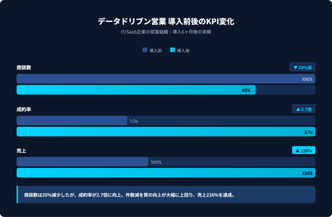 あるIT/SaaS企業の営業組織では、データドリブン営業の導入から6ヶ月で売上が226%に向上しました。成約率は従来の2.7倍に跳ね上がり、営業プロセス全体が変革されています。