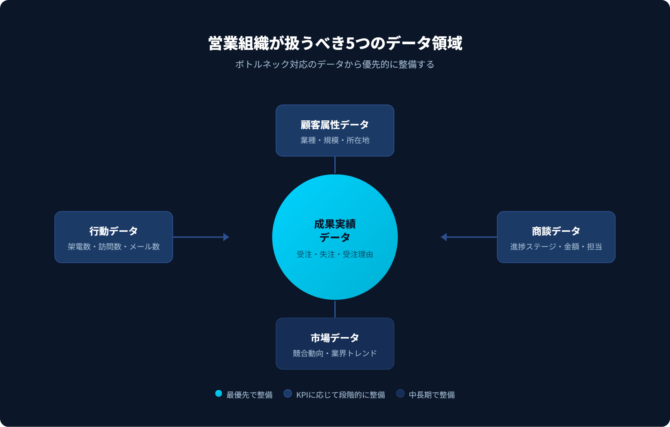 営業組織が蓄積すべきデータは大きく5つの領域に分かれます。顧客属性データ(業種・規模・所在地)、行動データ(架電数・訪問数・メール送信数)、商談データ(進捗ステージ・金額・担当者)、成果データ(受注・失注・受注理由)、そして市場データ(競合動向・業界トレンド)の5つです。