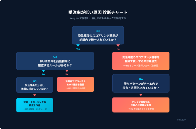 受注率を改善するには、営業プロセスをリード獲得・ヒアリング・提案・クロージングの4フェーズに分解し、どこにボトルネックがあるかを特定した上で手を打つことが最も確実です。フェーズごとに求められるスキルと改善策はまったく異なります。