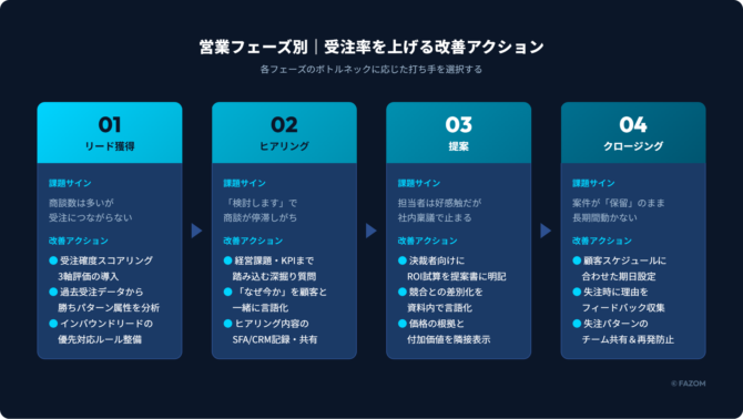 原因が明確になったところで、次のセクションでは営業プロセスの4フェーズそれぞれで受注率を改善する具体的な方法を解説します。
