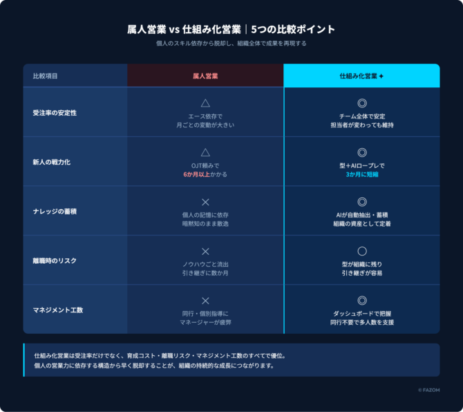 受注率の高いチームと低いチームの最大の違いは、勝ちパターンが言語化・共有されているかどうかです。エースの商談スキルが暗黙知のまま個人に閉じている限り、チーム全体の受注率は一部の担当者に依存し続けます。