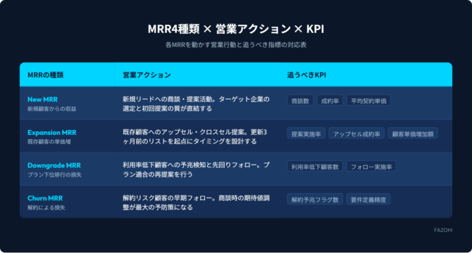 MRR4種類と営業アクションの関係を整理すると、以下の対応表になります。各MRRを動かすための営業行動が明確になれば、週次の行動計画に直結させることが可能です。