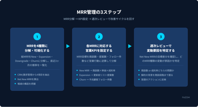 MRRの4分解と週次レビューの仕組みを自チームに導入し、Net New MRRを着実に積み上げる営業組織を目指してください。