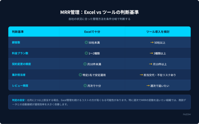 上記の条件のうち2つ以上が「ツール導入を検討すべき条件」に該当する場合、Excel管理を続けるコストの方が高くなる可能性があります。特に週次でMRRの変動を追いたい組織では、商談データとMRRを自動で接続できるツールの導入が運用効率を大きく改善します。