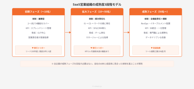SaaS営業組織の設計で最も重要なのは、自社の成長フェーズに合った体制を選ぶことである。従業員10名のスタートアップと50名を超える成長企業では、最適な分業の形がまったく異なる。ここでは「SaaS営業組織の成熟度3段階モデル」として、フェーズごとの最適体制と、次のフェーズに移行すべきトリガーを整理する。
