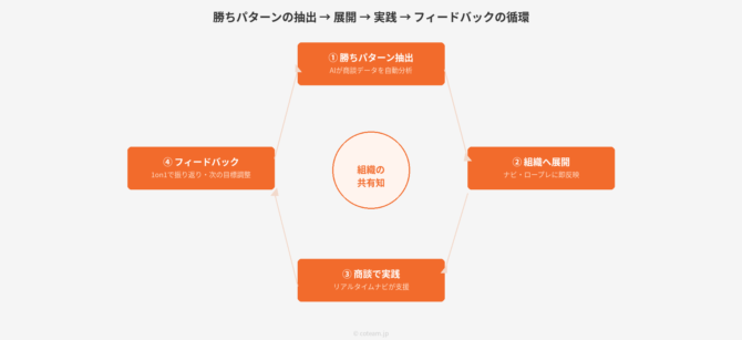 セールスイネーブルメントの中核は「属人的な営業ノウハウを組織の共有知に変える」ことにある。トップセールスの頭の中にある勝ちパターンを抽出し、再現可能な形に変換して、チーム全体に展開する。このプロセスが仕組み化されていなければ、優秀な営業メンバーが退職した瞬間にノウハウが消える。