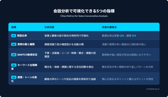会話分析で取得できるデータは多岐にわたりますが、営業組織の改善に直結する指標は次の5つに集約されます。これらを定点観測することで、チーム全体の商談品質を客観的に評価できるようになります。