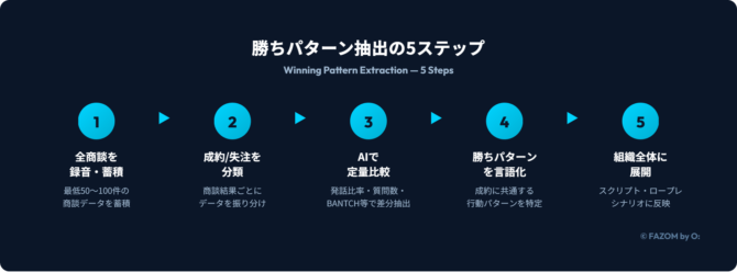 STEP 3が分析の核心です。成約と失注のデータをAIで比較し、発話比率・質問の数と種類・競合言及への対応パターン・クロージングのタイミングといった項目で定量的な差を洗い出します。STEP 4では、成約案件に共通する行動パターンを「勝ちパターン」として言語化します。